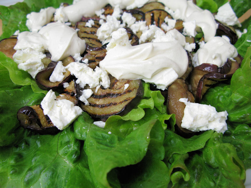 de sla schoon en maak de salade op met sla, plakjes aubergine en feta. Giet de